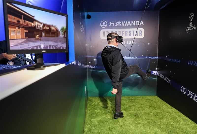 2018年7月8日,又名媒体记者在莫斯科卢日尼基畅通场外的万达VR互动中心体验VR足球挑战状貌。\n 当日,万达集团在莫斯科卢日尼基畅通场外举办媒体通达日行径,向中外媒体先容万达集团与国际足联的互助及与俄罗斯全国杯关连的情况。国际足联与万达集团于2016年订立策略互助合同,万达成为中国首个国际足联顶级扶植商,合同有用期15年。\n 新华社记者单宇琦摄