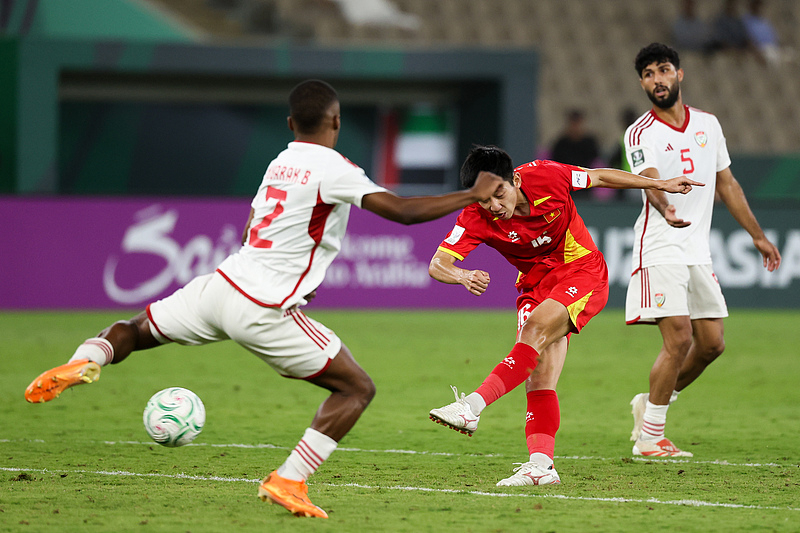 越南队(红)在四分之一决赛中以3比2打败阿联酋队