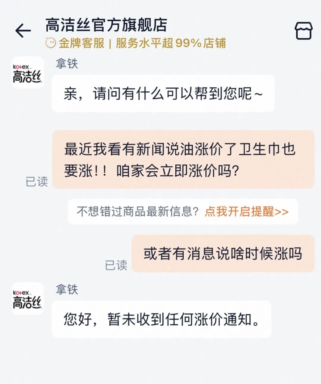 苏菲官方旗舰店客服暗示,当今店内商品莫得收到要涨价的见告。价钱会受原材料、举止等影响,忽视以商品确定页及时浮现为准。淌若近期有举止,结算页也会自动浮现优惠。