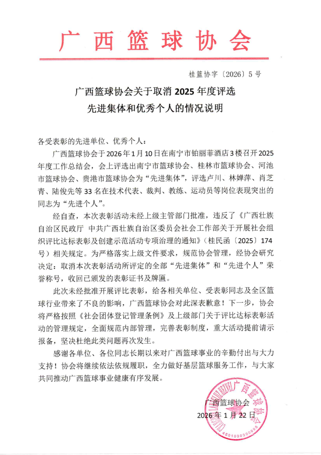1月22日,广西篮球协会发布“对于取消2025年度评比先进集体和优秀个东谈主的情况讲解”。