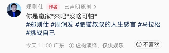 1月19日,74岁的“肥猫”郑则仕曾发视频分享自己首次跑完马拉松10公里赛事的经历,并配文:“你是赢家,来吧,没什么可怕。”