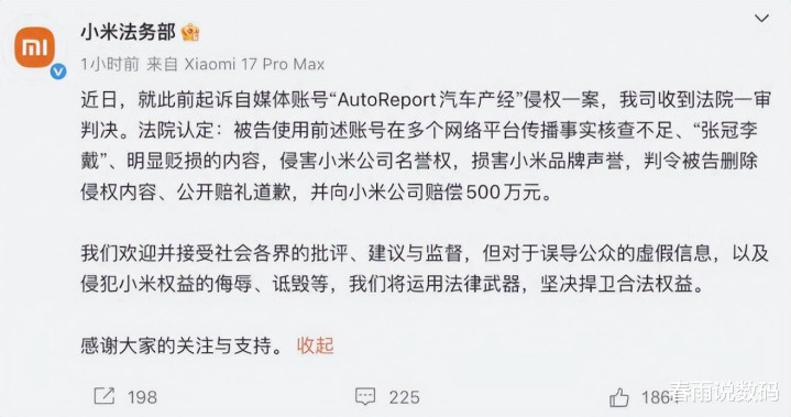 近日,小米法务部通过官方微博发布了一则重磅音书:小米告状自媒体账号“AutoReport汽车产经”名誉权侵权一案一审宣判,小米公司胜诉。法院认定该自媒体账号在多平台传播的内容存在事实核查不及、“张冠李戴”、光显贬损等问题,侵害了小米公司名誉权,判令被告删除侵权内容、公开赔礼谈歉,并向小米公司抵偿500万元。