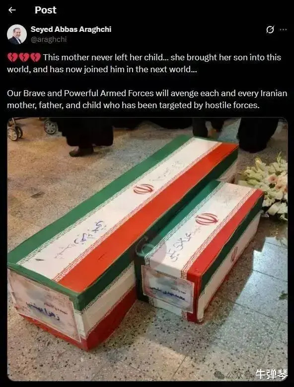 伊朗外长阿拉格王人发了一条推文,配图是一大一小两口棺木,内部是被炸死的姆妈和她的孩子。