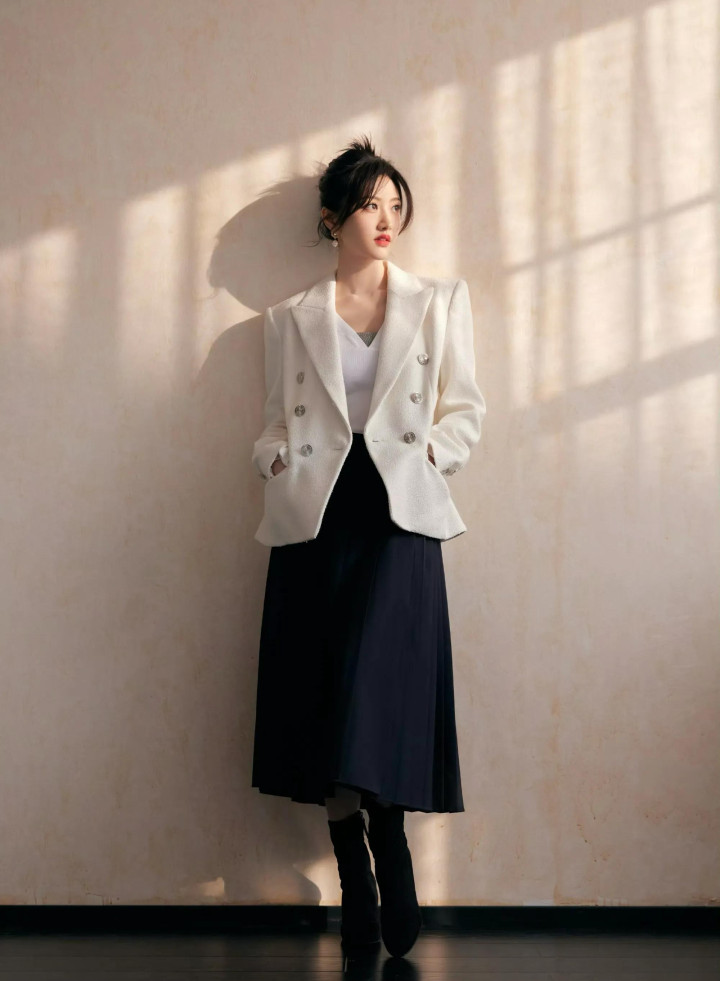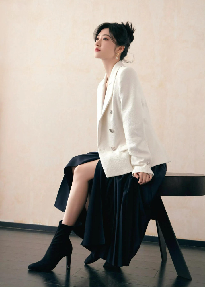 景甜白色毛呢西装外衣搭配玄色半身裙,体格苗条,结拜好意思腿性感迷东说念主,开云体育中国官网入口澳门威斯人精细盘发干练利落,行径优雅介意,魔力完全!