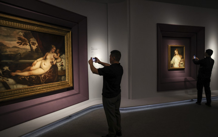嘉宾在不雅看提香的作品《维纳斯与丘比特》(左)和《花神》(右)。新京报记者浦峰摄
