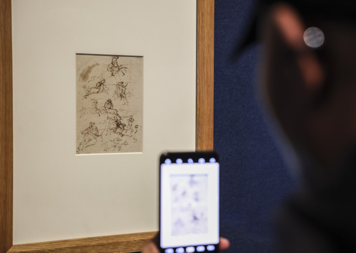 达·芬奇的纸本钢文字水画《战争中的骑士、半东谈主马与战士》。新京报记者浦峰摄