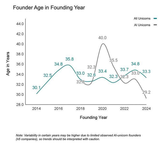 数据在短期内赈济这种乐不雅。凭据风投契构Antler对巨匠1,629家独角兽公司和3,512位独创东说念主的分析,AI独角兽独创东说念主在公司建树当年的平均年纪已从2020年的40岁降至2024年的29岁。
