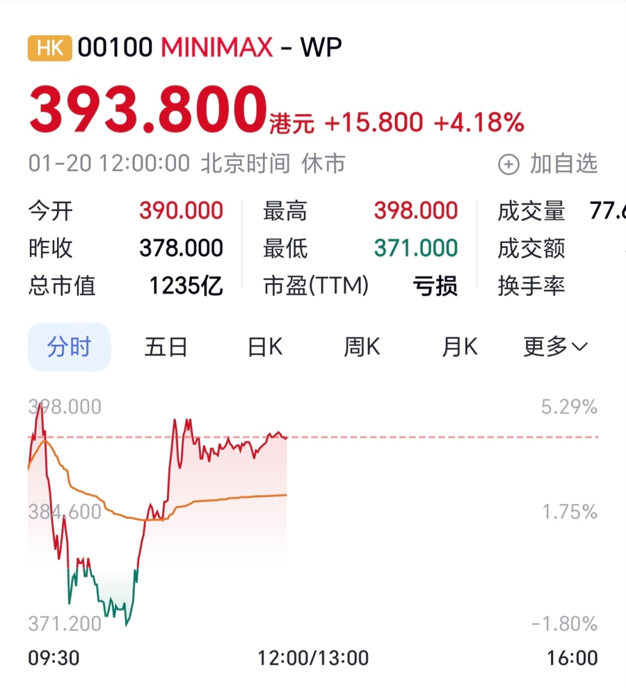 甩手今天中午,MiniMax股价已达393.8港元,总市值破1235亿港元,市值已卓著先于MiniMax在港交所上市的“大模子第一股”智谱AI(920亿元)。