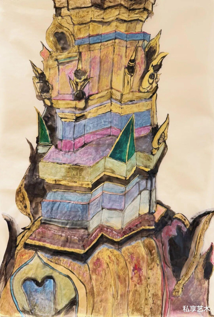 与中国传统建筑追求纷乱体量、横暴威望不同,泰国宗教建筑将精神性落实于极致的精微、精细与纪律之中。在梵刹中,艺术家感受到一种不同于叙事性宗教壁画的精神场域:壁画不再是东说念主格化的故事铺陈,而呈现出一种神与灵的气韵全体。