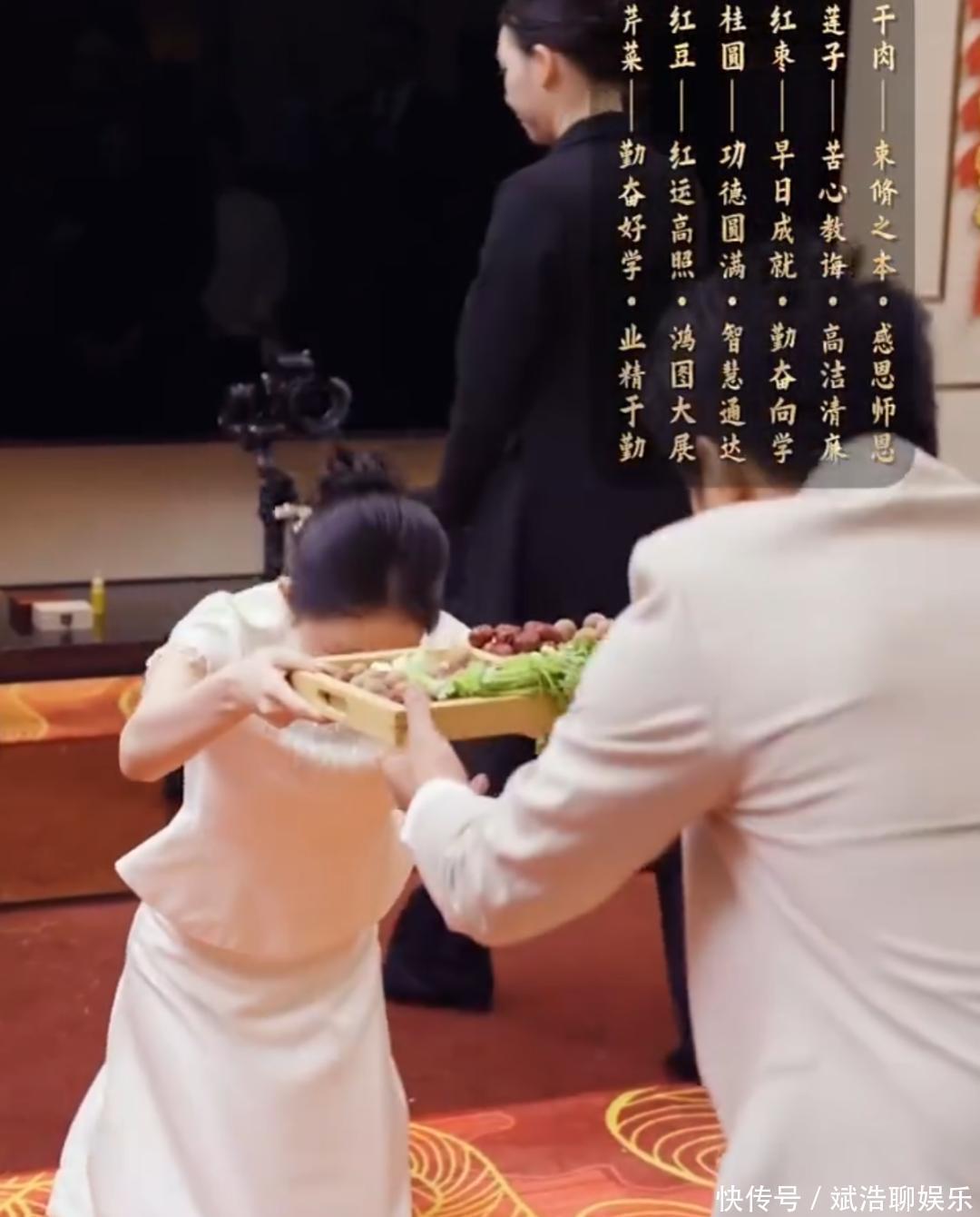 直播画面里,有着4400多万粉丝的快手女网红徐婕一气呵成,完成了净手整冠、跪读拜师帖、行三拜礼(谢引路、感锻练、承行状)、敬茶等整套古礼进程。