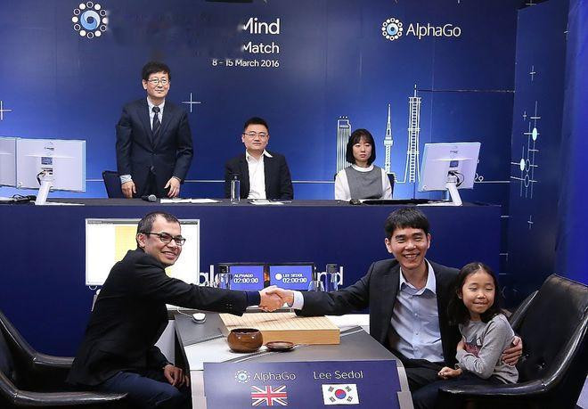 2016年3月9日,首尔四季旅店,Hassabis(左)与韩国围棋九段李世石赛前持手。几天后AlphaGo以4:1打败李世石,大家卓越2亿东说念主不雅看。这是AI初度在围棋上打败宇宙顶级东说念主类棋手,亦然Hassabis登上宇宙舞台的时刻。