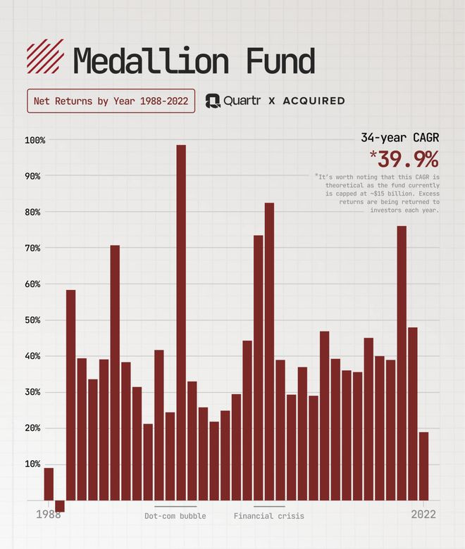 按公开数据,1988到2022年,34年复合年化增长率约39%,大奖章基金累计为投资者创造了卓越9万倍的净薪金。