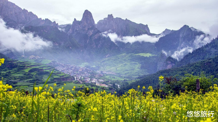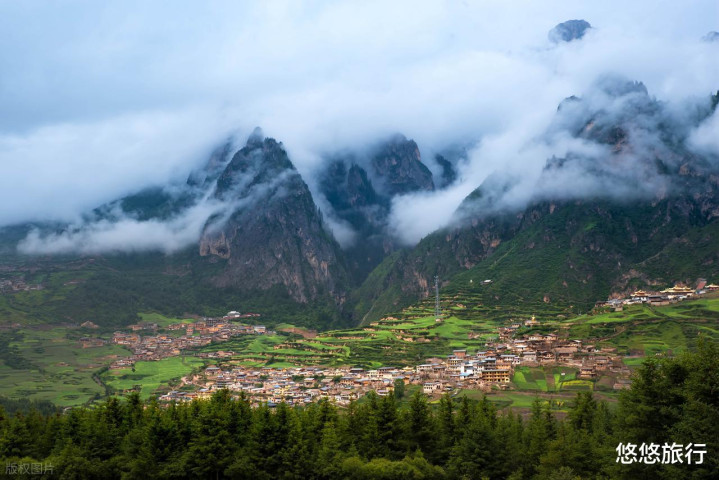被群山环抱的村庄,视线中的大片金色寺庙诞生,纯洁尊严。黎明的阳光洒在石峰上,自然石城拉开了它的面纱,藏寨的板屋顶时隐时现。