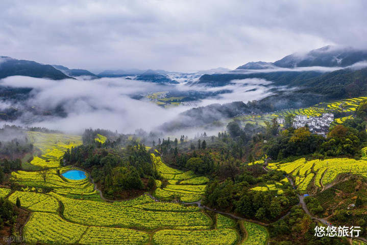 篁岭的晒秋东谈主家遇上梯田花海,桃花粉红、梨花鲜明,点缀其间。江岭万亩油菜花铺满梯田,灰瓦白墙的村庄满是生存气味,花期捏续到4月初。