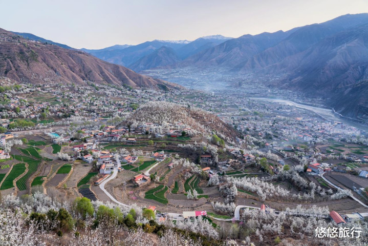 当春风拂过丹巴山谷,中路藏寨迎来了最好意思的季节。白塔不雅景台俯视所有藏寨,黎明有云海,傍晚有落日余光,漫山梨花与碉楼。