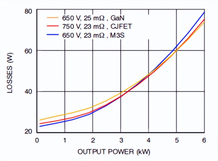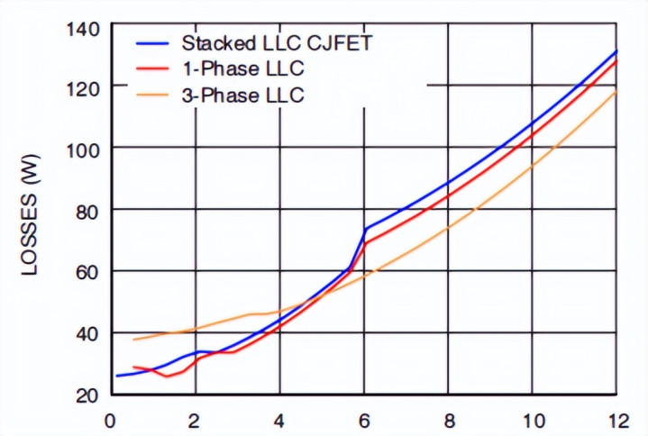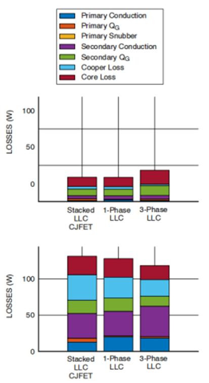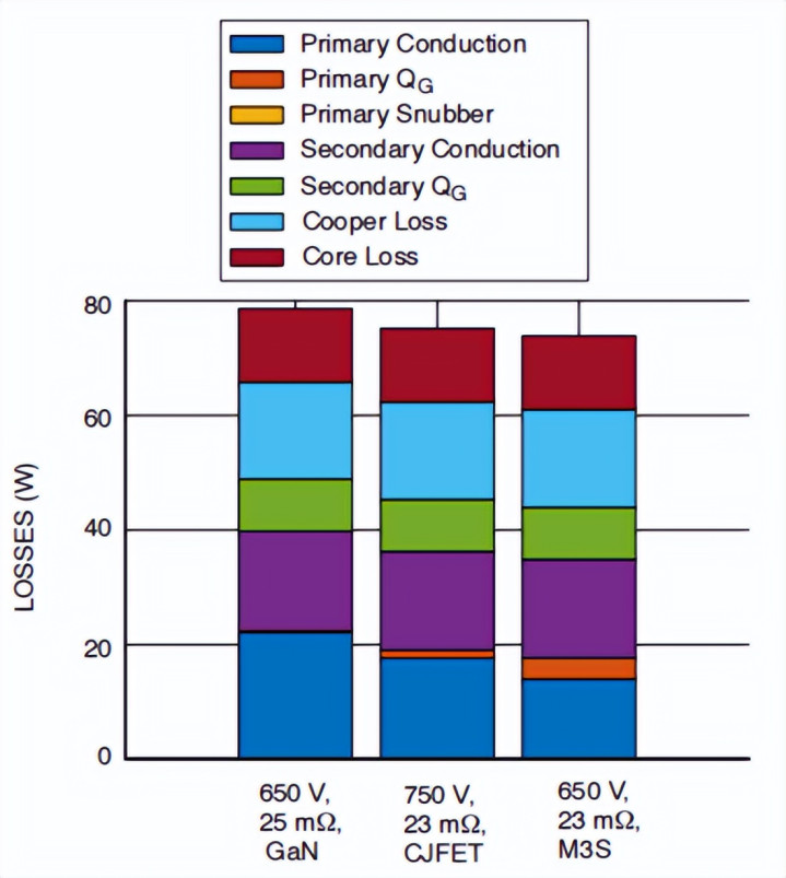 图2. 采用不同原边开关器件的堆叠式LLC赈济器系统损耗