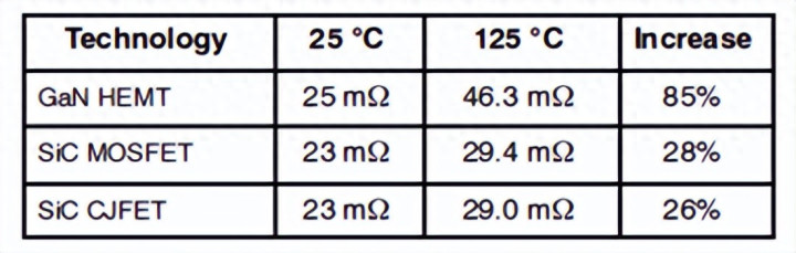 Rds,on会随温度升高而加多,其标称值仅适用于25℃的结温。下表对比了典型GaN器件、安森好意思(onsemi)M3S 650 V器件以及安森好意思第四代CJFET 750 V器件的导通电阻随温度高涨的情况。
